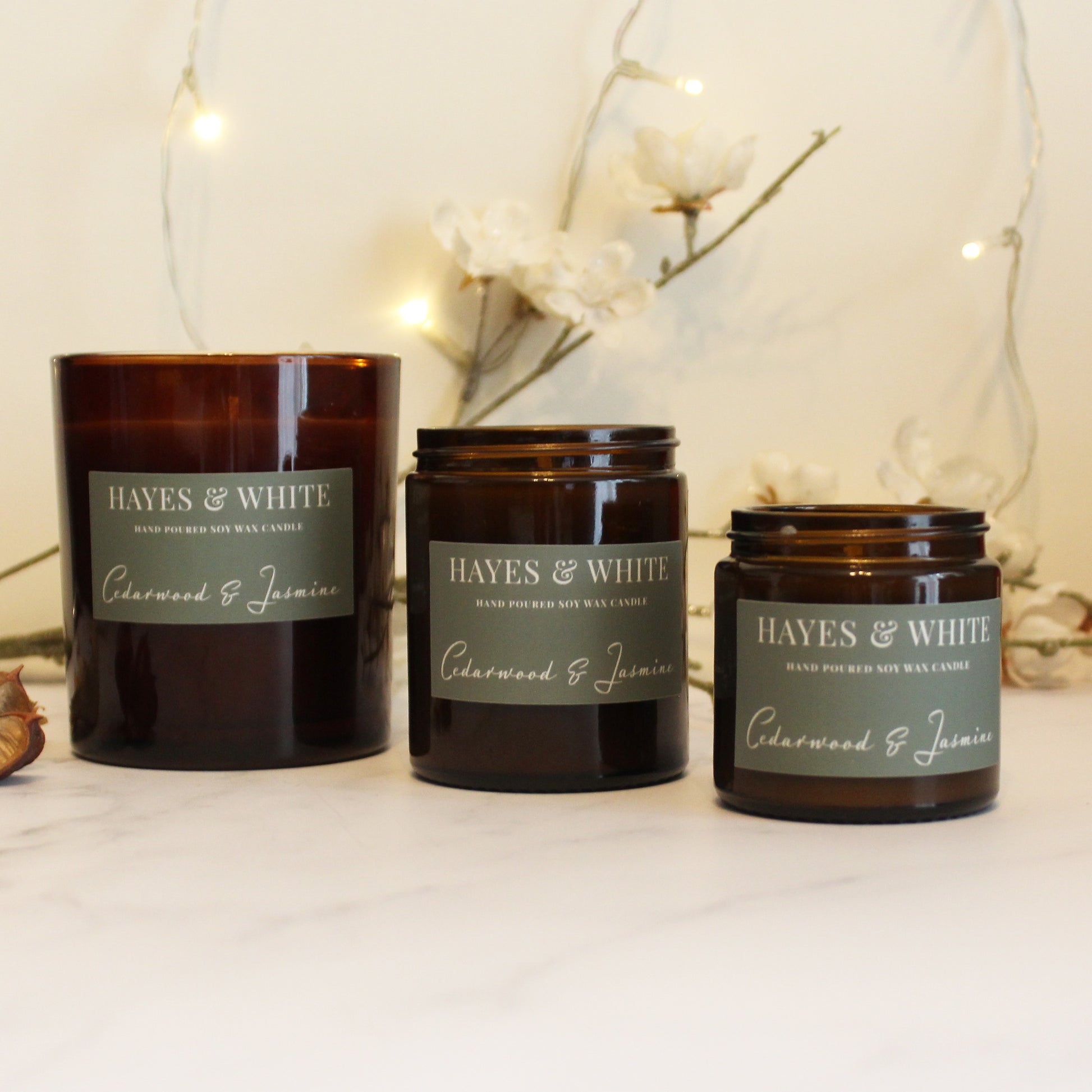 Handcrafted Soy Wax Candle. Cedarwood and Jasmine is a warm, elegant blend which balances earthy wood notes with gentle floral sweetness.Â